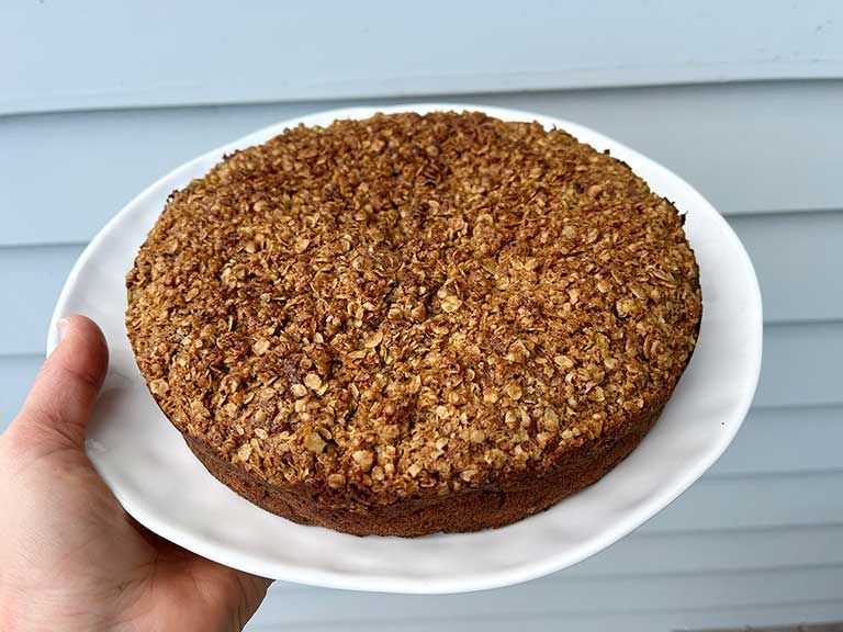 Melt the butter in the same pot, add the rolled oats, coconut sugar and cinnamon. Spread evenly over the top of the cake.